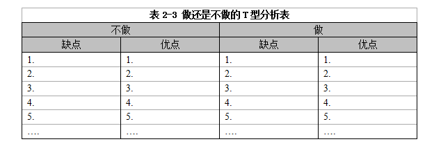 此時,如果你習慣性地拿出一支筆、一張白紙,隨手畫一個T型分析表(見表2-2),也許就能幫你快速理清思路,做出你真正想要的那個正確的選擇。