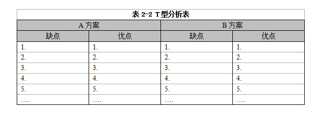 T型分析表中的“缺點、優(yōu)點、好處、壞處”等欄中應盡可能多地列出相應的答案,確保你對該問題的思考能保持足夠的深度與廣度。